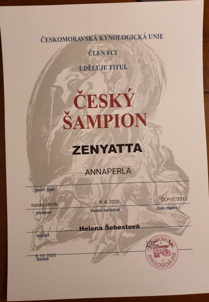 Babička Daniellky je naše dnes již 13 letá ATIYA ASMA Annaperla, historicky první chrtík ČR, kterého zdobí prestižní titul COURSINGOVÝ MISTR EVROPY, pro který si doběhla v roce 2013 na Mistrovství Evropy v Německu a získala nejvyšší ohodnocení z konkurence 57 chrtíků na startu!