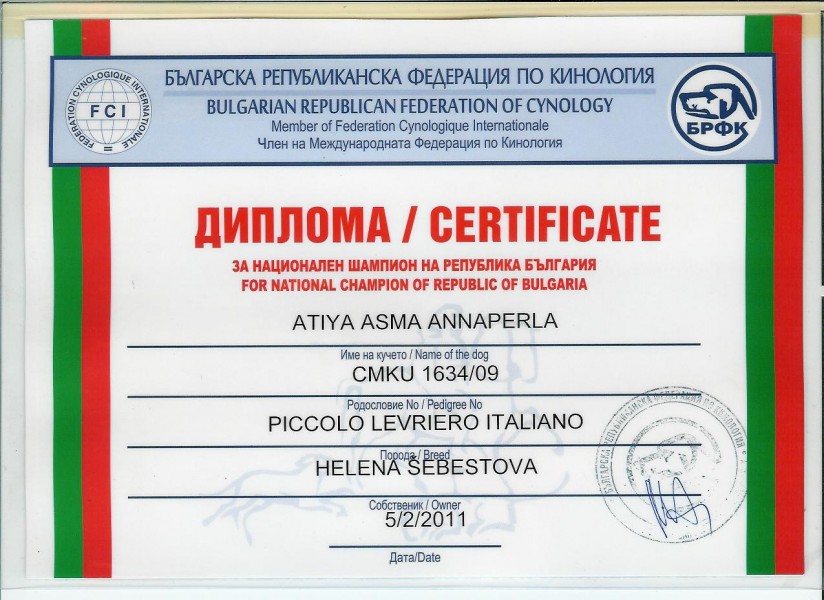 Naše ATIYA je první fenkou italského chrtíka v historii České republiky, které dosáhla na prestižní titul